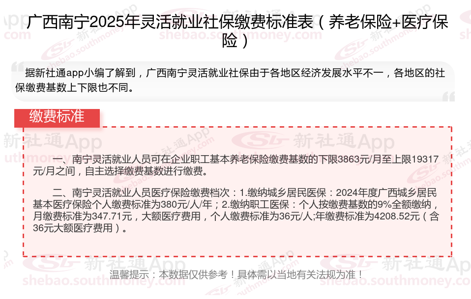 据新社通app数据显示,2024-2025年广西南宁灵活就业人员养老保险的缴费标准:
