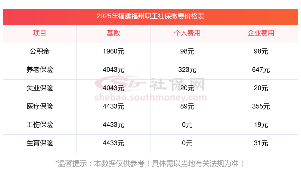 2025年福建福州社保缴费多少钱?下表是2024-2025年福建福州社保费用明细参考,新社通app-社保缴费查询工具提供的最新数据如下: