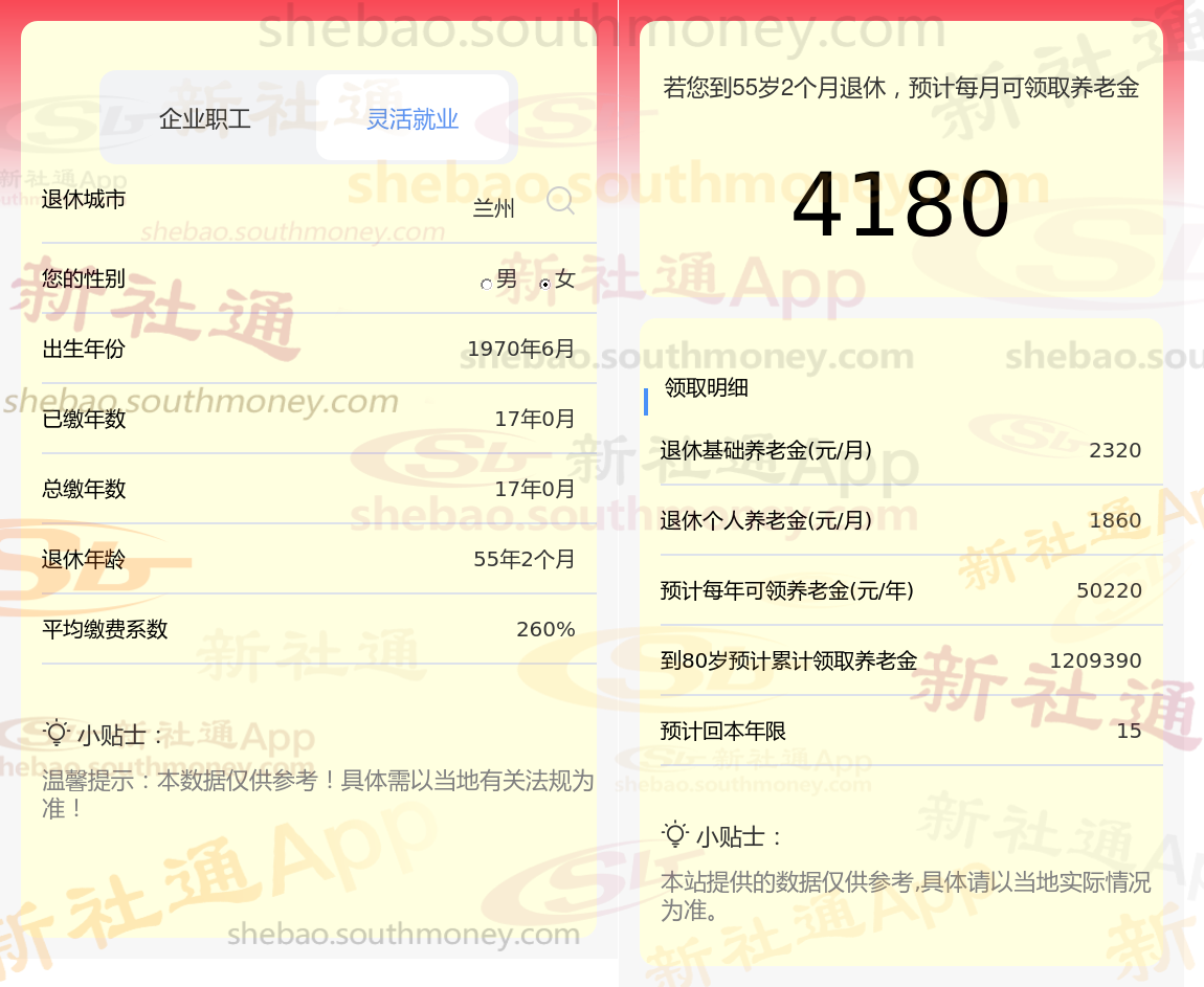 退休城市:甘肃兰州,性别:女,出生年份:1970,总缴年数17年,缴费档次:260%,新社通app养老金计算器所得: