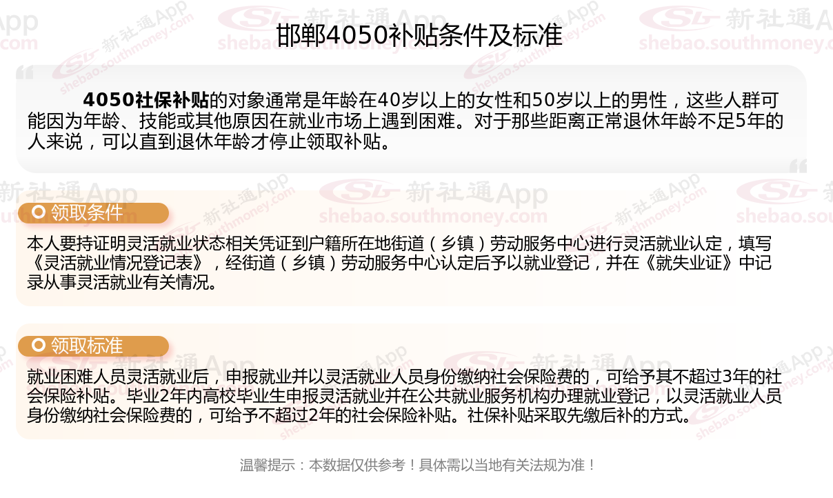 2025邯郸灵活就业4050社保补贴是一项面向特定年龄段的就业困难人群的社会保险补贴。