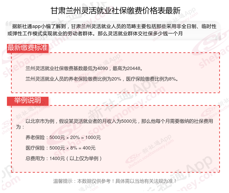甘肃兰州灵活就业自己交社保一个月要交多少钱?根据新社通app-社保缴费查询工具提供的最新数据如下: