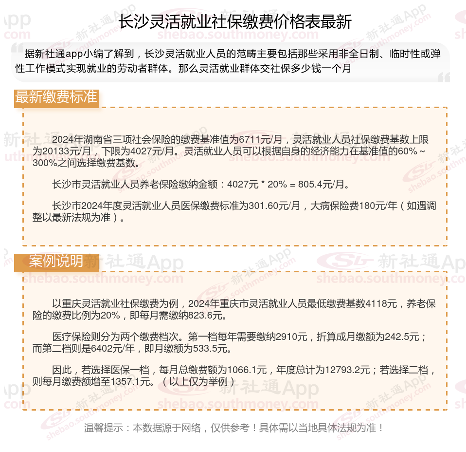 据新社通app数据显示,2024-2025年长沙灵活就业人员养老保险的缴费标准: