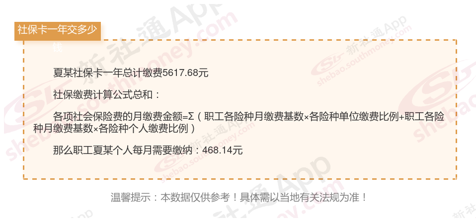 由上图得知,夏某社保卡一年需要缴纳5617.68元,职工个人月缴纳468.14元,若您想要了解明细点击新社通社保计算器,来了解一下明细吧。