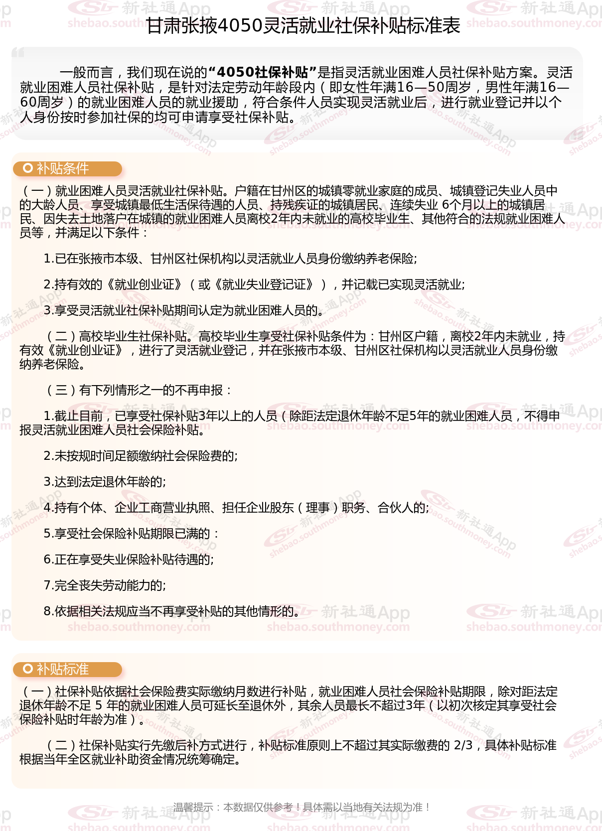 二、甘肃张掖4050社保补贴标准及条件4050社保补贴,最新如下