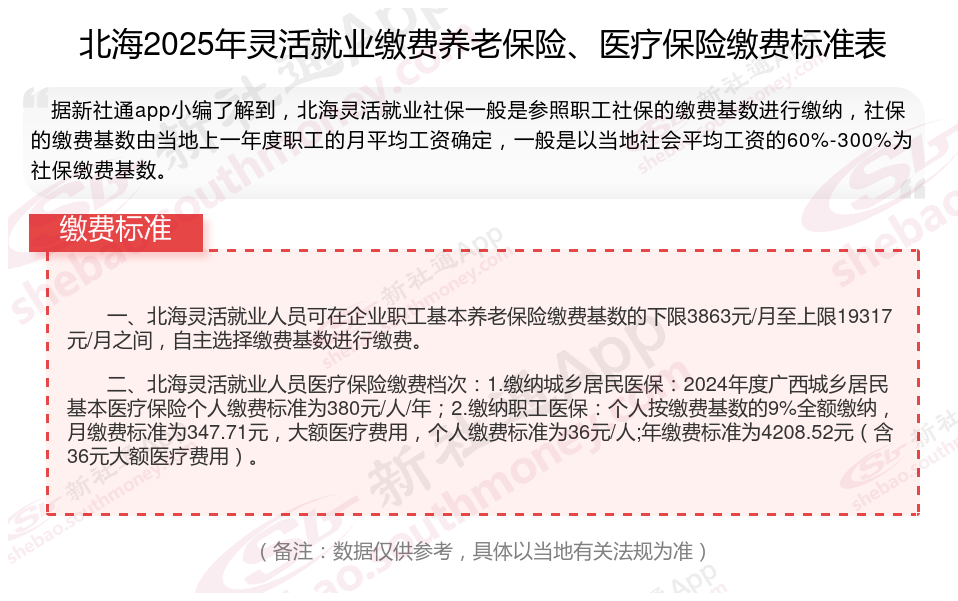 据新社通app数据显示,北海企业灵活就业养老保险的缴费基数为:4053.6元。