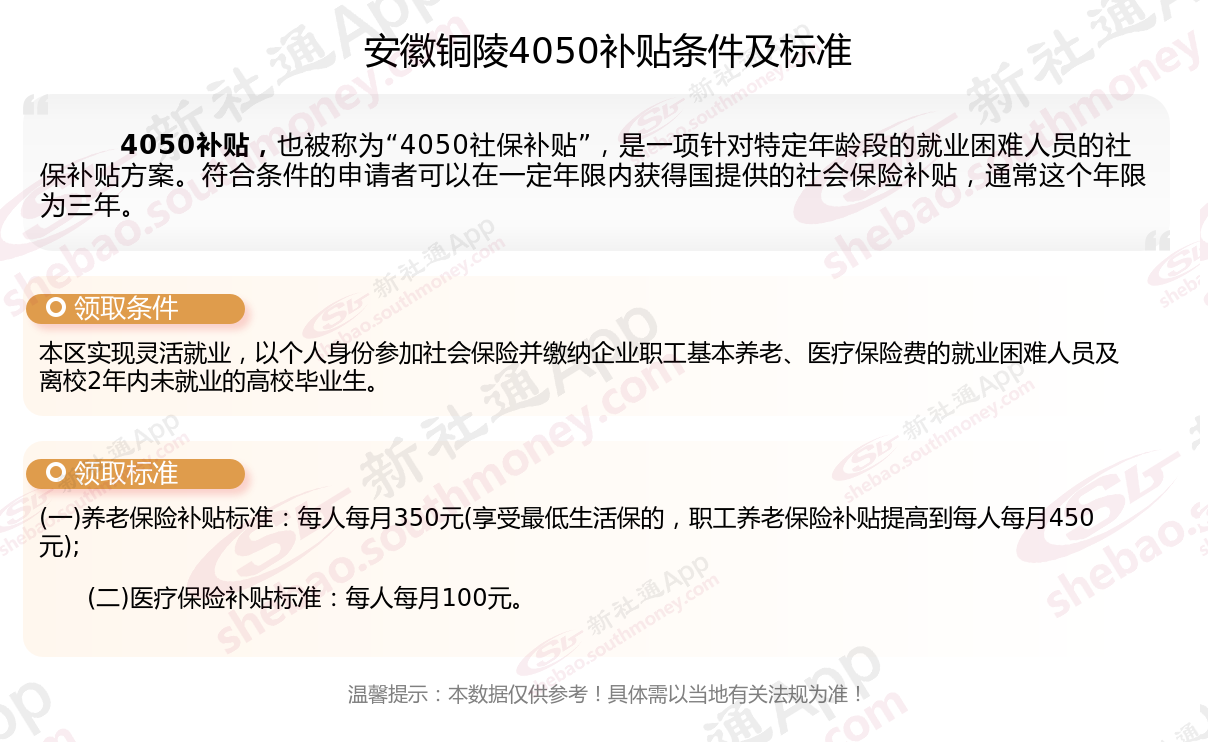 4050社保补贴标准据新社通app小编了解,通常,4050社保补贴包含基本医疗保险和基本养老保险两个险种,社保补贴金额为申请人实际缴纳基本养老保险和基本医疗保险金额的2/3,具体标准以当地社保局公布的数据为准!那么安徽铜陵灵活就业人员4050补贴最新标准是多少,安徽铜陵4050灵活就业人员社保补贴一年可以有多少钱?接下来随新社通APP小编具体了解一下4050社保补贴内容。