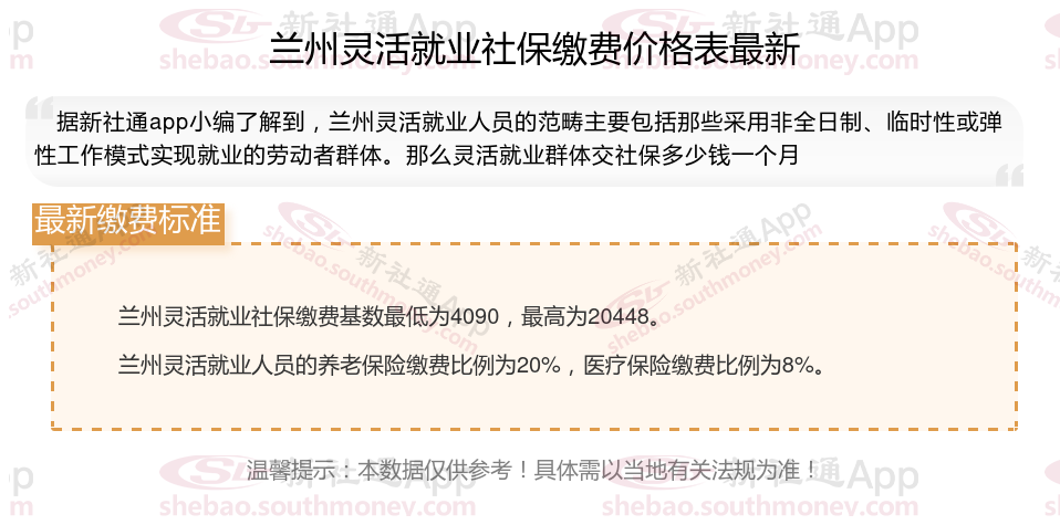 据新社通app数据显示,兰州灵活就业养老保险缴费基数2024-2025年最新标准如下: