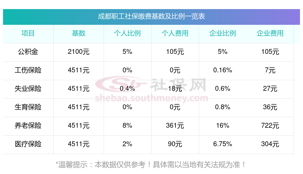 2025年成都社保缴费多少钱?下表是2024-2025年成都社保费用明细参考,新社通app-社保缴费查询工具提供的最新数据如下: