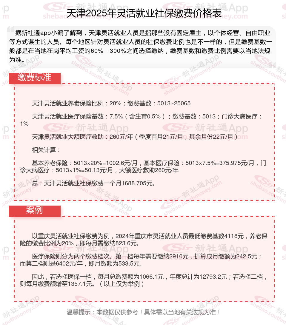 提示:天津灵活就业人员每个月的缴费压力还是比较大的,每个月的社保费用都是千元,缴费档次越高,灵活就业人员要缴纳的费用也越多。