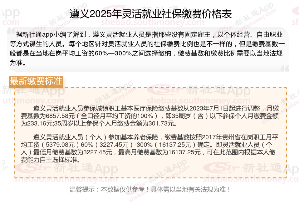 遵义灵活就业人员社保缴费档次表:一般分为五个档次,具体为上年度在岗职工平均工资的60%、70%、80%、90%和100%。灵活就业人员可以根据自己的意愿选择缴费档次,缴费比例为20%,其中12%进入统筹基金,8%进入个人账户。