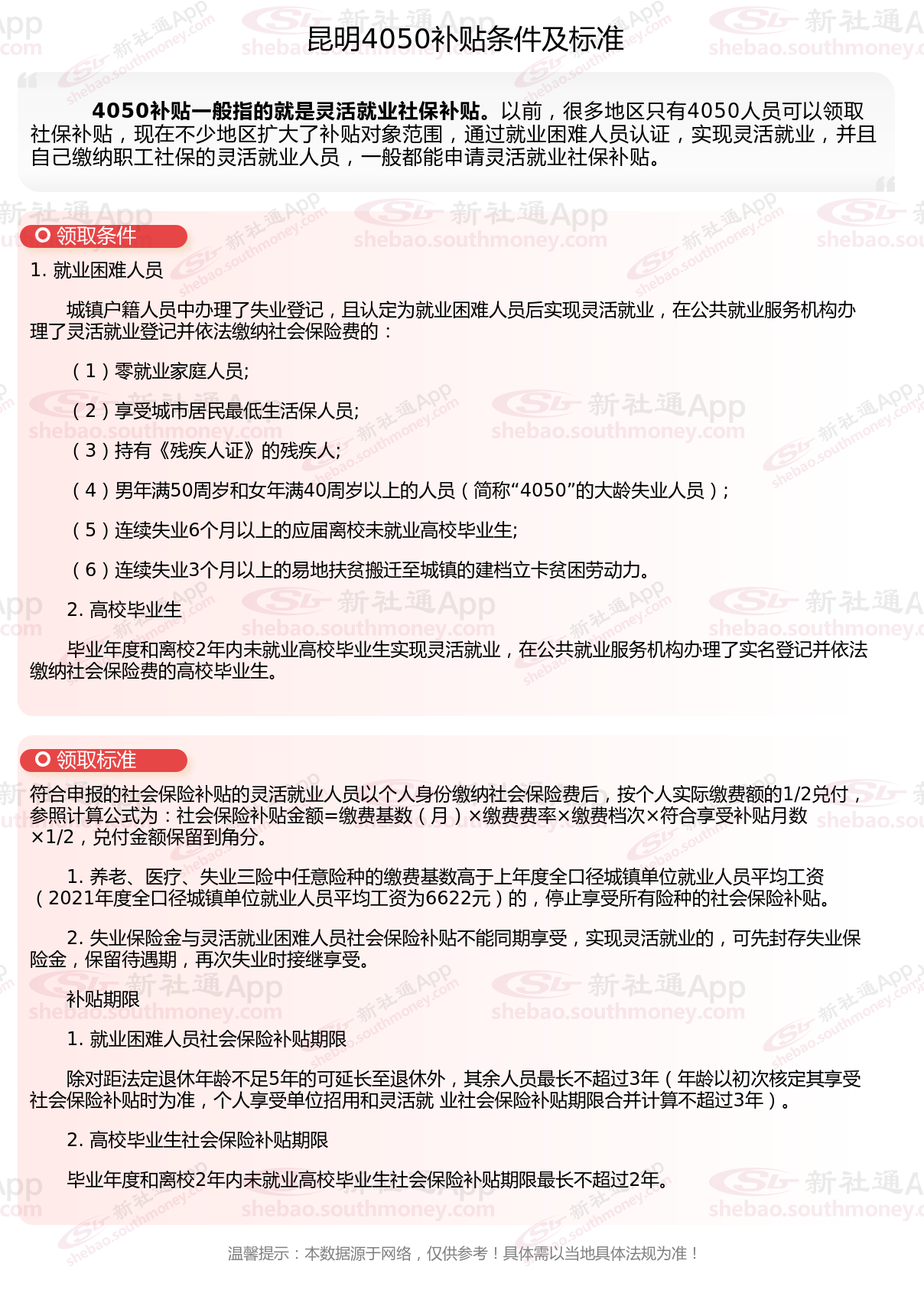 二、2025年昆明4050社保补贴标准及条件,最新如下: