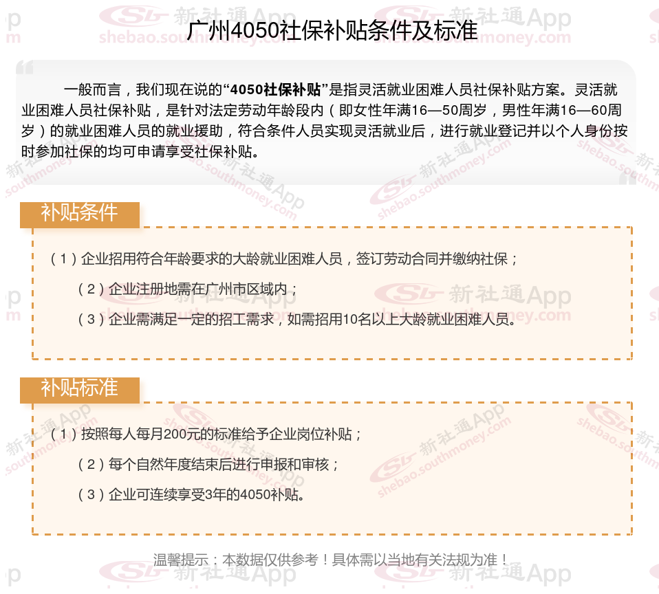 广州4050灵活就业社保补贴是什么?今天聊一下4050补贴话题。4050补贴听起来像是一个针对特定年龄人群的社保补贴。比如女性需年满40周岁,男性需年满50周岁(以申请当年12月31日为截止日期)。那么广州4050灵活就业社保补贴标准是多少钱?广州4050社保补贴可以领取多少?接下来随新社通APP小编了解一下广州4050灵活就业社保补贴的最新资讯。