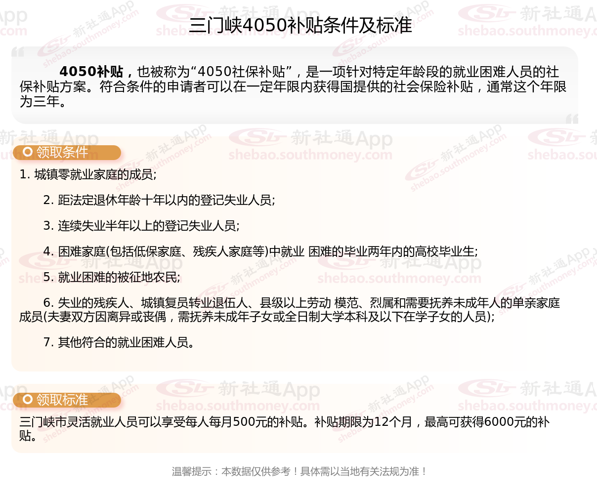 4050补贴主要是针对大龄就业困难人群的社保补贴,申请条件包括年龄、就业困难、灵活就业并自费缴纳社保,需要持有失业登记证,不同地区可能有细微差别,比如农村户口的限制。那么三门峡4050灵活就业社保补贴标准是多少钱?三门峡4050社保补贴条件是什么?接下来随新社通APP小编了解一下最新资讯。