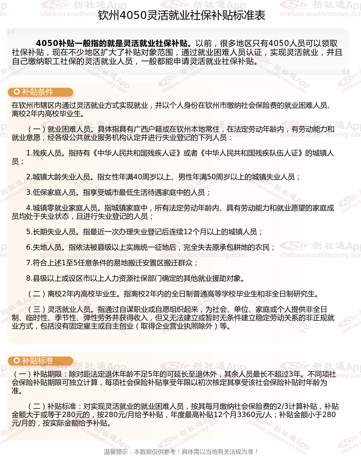 今天聊一下4050补贴话题。4050补贴听起来像是一个针对特定年龄人群的社保补贴。比如女性需年满40周岁,男性需年满50周岁(以申请当年12月31日为截止日期)。那么钦州4050灵活就业社保补贴标准是多少钱?钦州4050社保补贴条件是什么?接下来随新社通APP小编了解一下最新资讯。