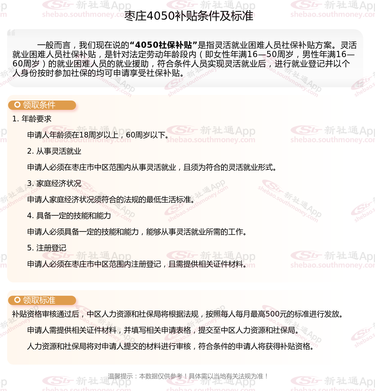 二、2025年枣庄4050社保补贴标准是多少?领取条件是什么?