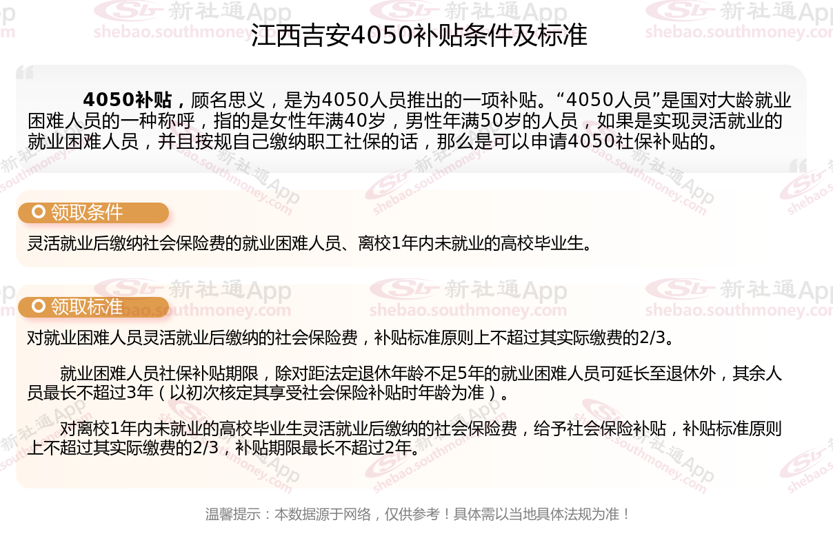 一、江西吉安4050社保补贴标准及条件2025年最新消息