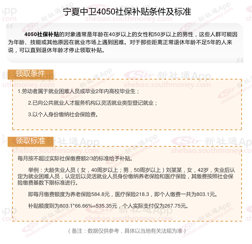 二、2025年宁夏中卫4050社保补贴标准是多少?领取条件是什么?