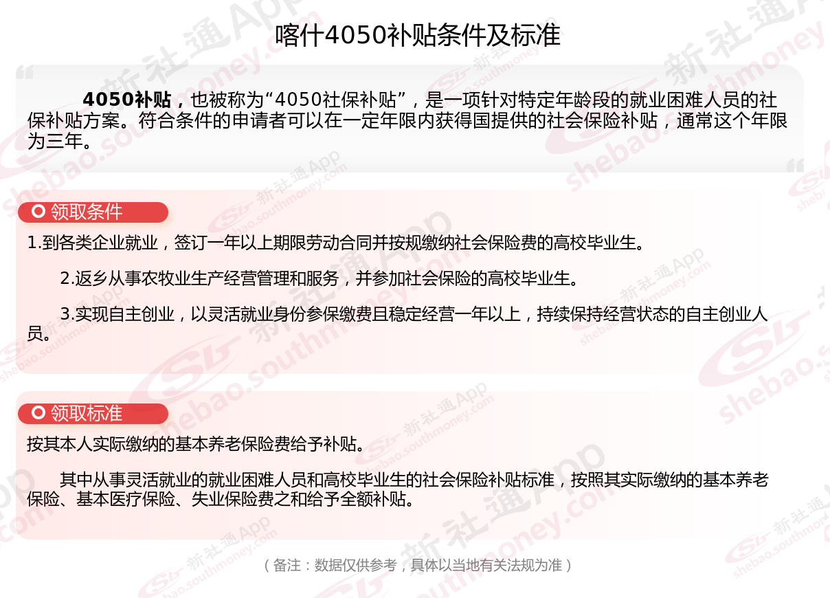 今天聊一下4050补贴的相关内容。4050补贴听起来像是一个针对特定年龄人群的社保补贴。比如女性需年满40周岁,男性需年满50周岁(以申请当年12月31日为截止日期)。那么喀什4050灵活就业困难人员社保补贴多少钱?喀什4050社保补贴可以申请吗?接下来随新社通APP小编具体了解一下4050社保补贴内容。