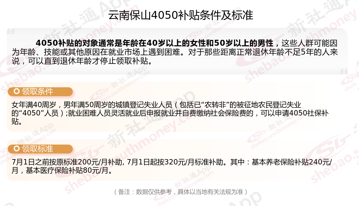 4050补贴主要是针对大龄就业困难人群的社保补贴,申请条件包括年龄、就业困难、灵活就业并自费缴纳社保,需要持有失业登记证,不同地区可能有细微差别,比如农村户口的限制。那么云南保山4050灵活就业社保补贴标准是多少钱?云南保山4050社保补贴条件是什么?接下来随新社通APP小编了解一下最新资讯。