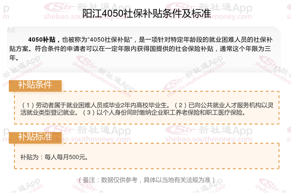 一、阳江4050社保补贴标准及条件2025年最新消息