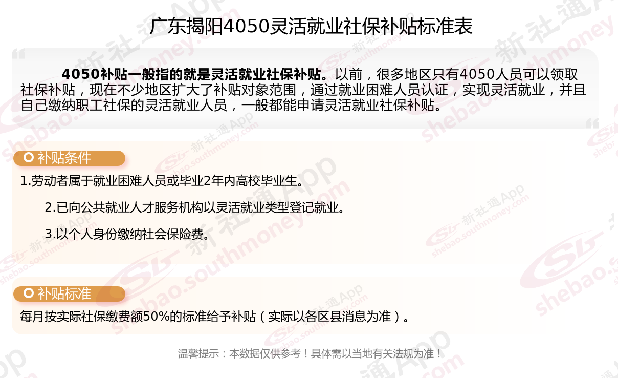 一、2025年广东揭阳灵活就业4050社保补贴标准及条件是什么
