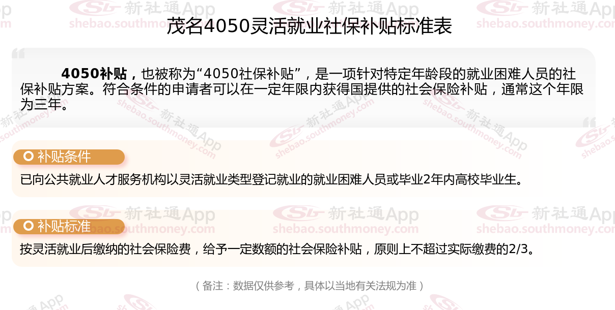 一、2023-2024年茂名4050社保补贴标准及条件是多少?