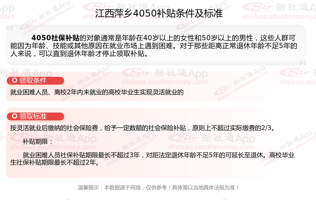 2025年江西萍乡4050社保补贴新规 2025年江西萍乡4050社保补贴标准及条件是什么?2025江西萍乡4050补贴主要针对的是年龄在40岁以上的女性和50岁以上的男性,这些人群通常因为年龄较大而面临就业困难。