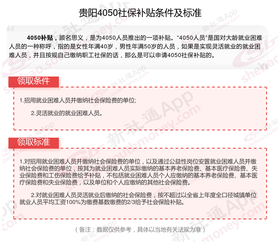 4050补贴需要以灵活就业身份参加职工养老和医疗保险,补贴标准不超过实际缴费的三分之二,最长3年,距离退休不足5年的可延长到退休。补贴对象包括国企下岗人员、低保家庭等。申请流程需要提交身份证、银行账户等。那么贵阳4050灵活就业社保补贴标准是多少钱?贵阳4050社保补贴条件是什么?接下来随新社通APP小编了解一下最新资讯。