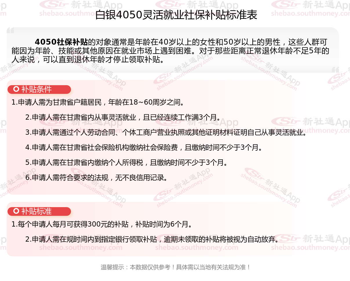二、2025年白银4050社保补贴标准及条件,最新如下: