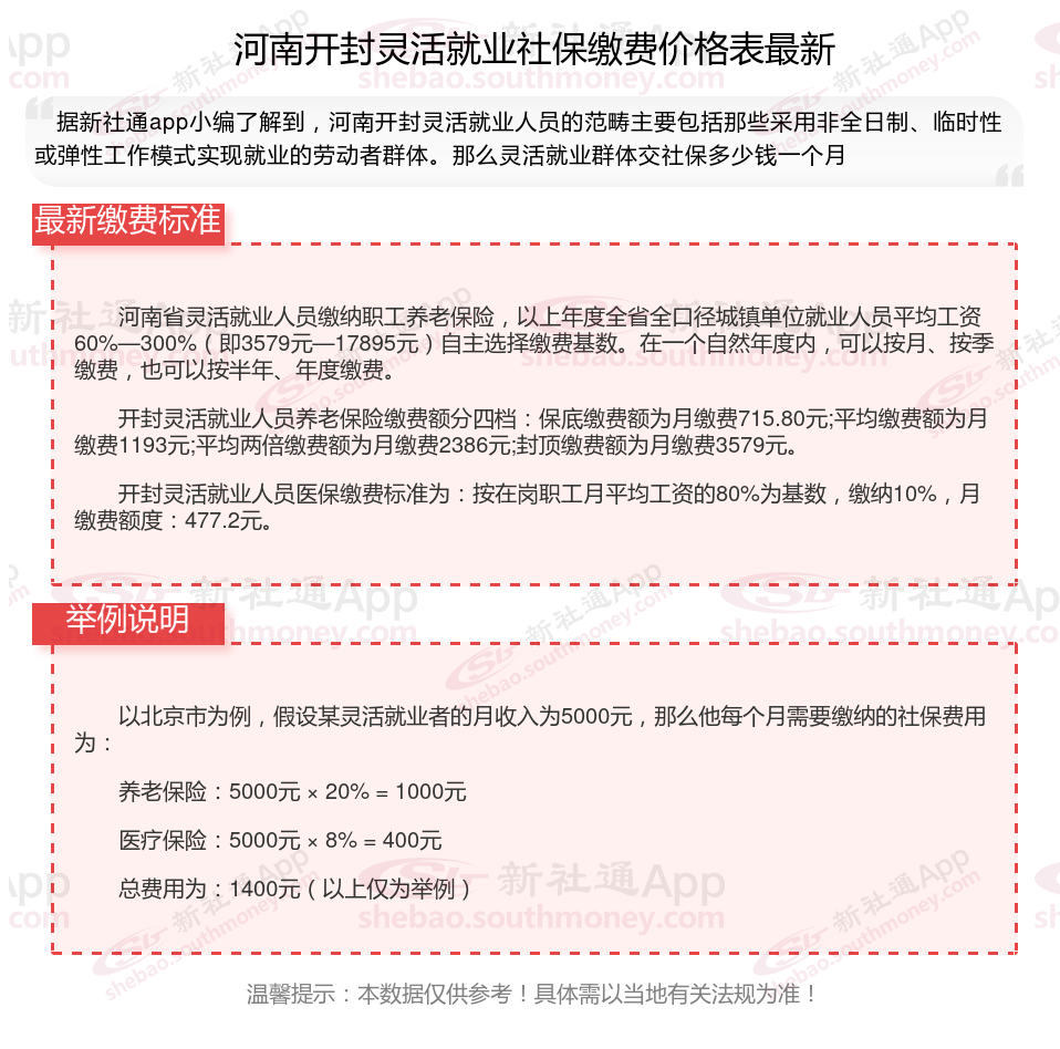 河南开封灵活就业人员的社保缴费标准是多少?根据新社通app-社保缴费查询工具提供的最新数据如下: