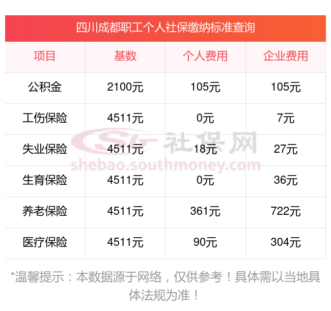 四川成都五险一金交多少钱一个月?下表是2024-2025年四川成都社保费用明细参考,新社通app-社保缴费查询工具提供的最新数据如下: