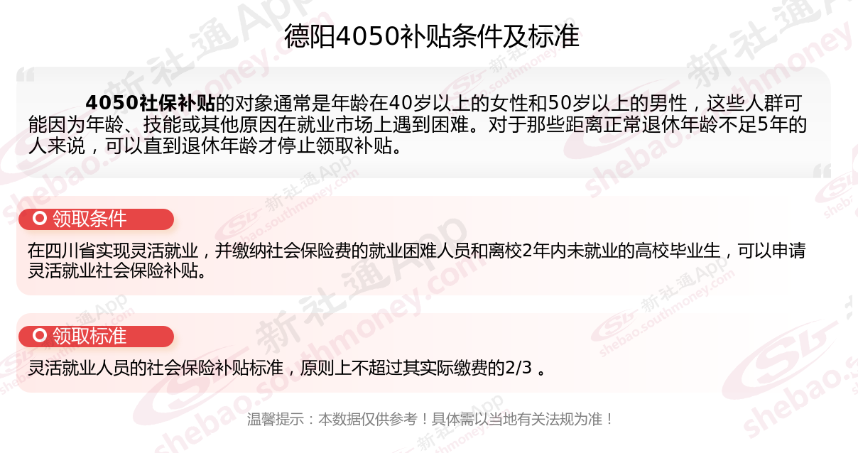 德阳4050灵活就业社保补贴标准如何?“4050补贴”主要是针对大龄就业困难人群的社保补贴,申请条件包括年龄、就业困难、灵活就业并自费缴纳社保,需要持有失业登记证,不同地区可能有细微差别,比如农村户口的限制。那么德阳4050灵活就业社保补贴标准是多少钱?德阳4050社保补贴条件是什么?接下来随新社通APP小编了解一下德阳4050灵活就业社保补贴标准最新资讯。