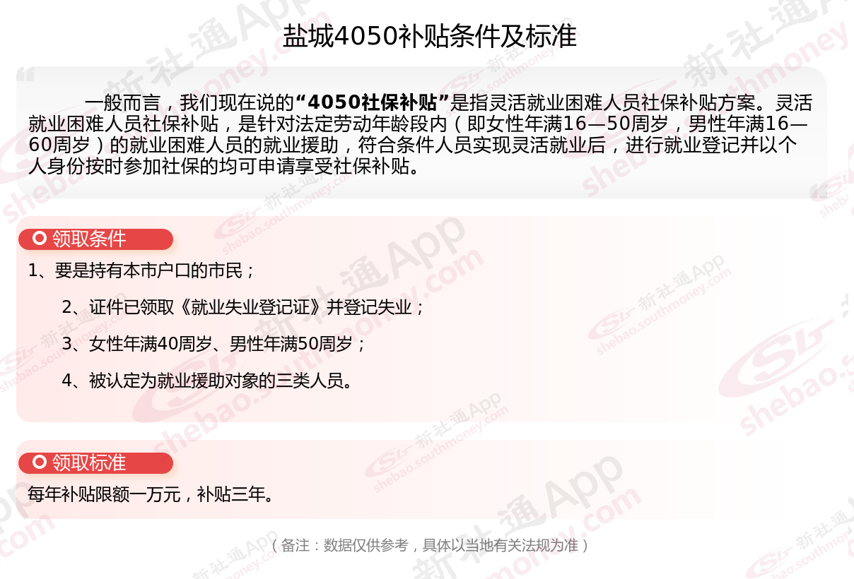 二、2025年盐城4050社保补贴标准及条件,最新如下: