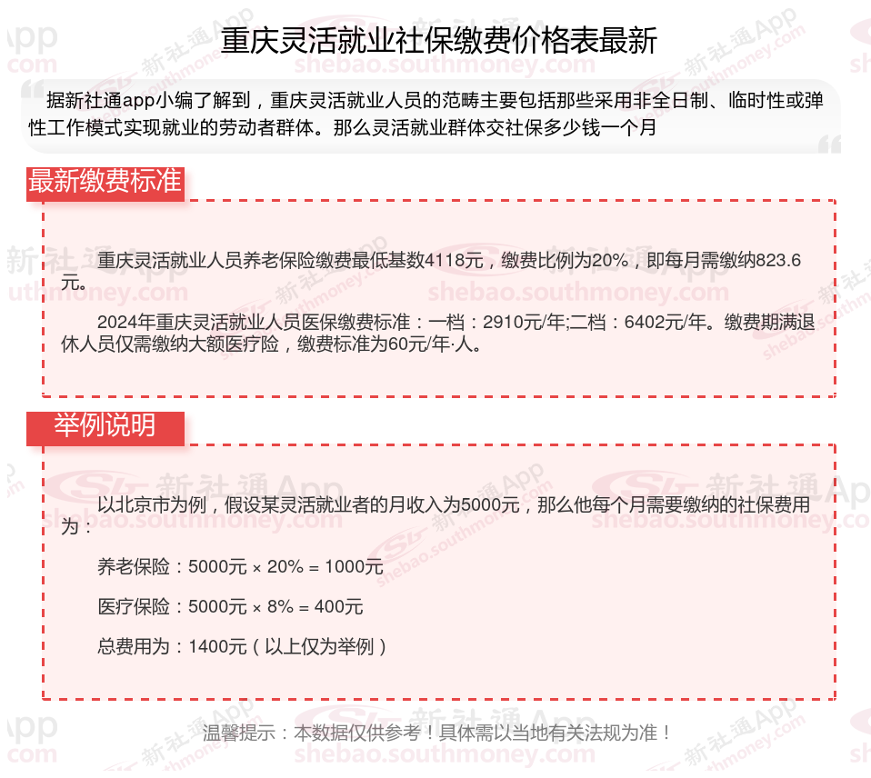 据新社通app数据显示,重庆灵活就业养老保险缴费基数2024-2025年最新标准如下: