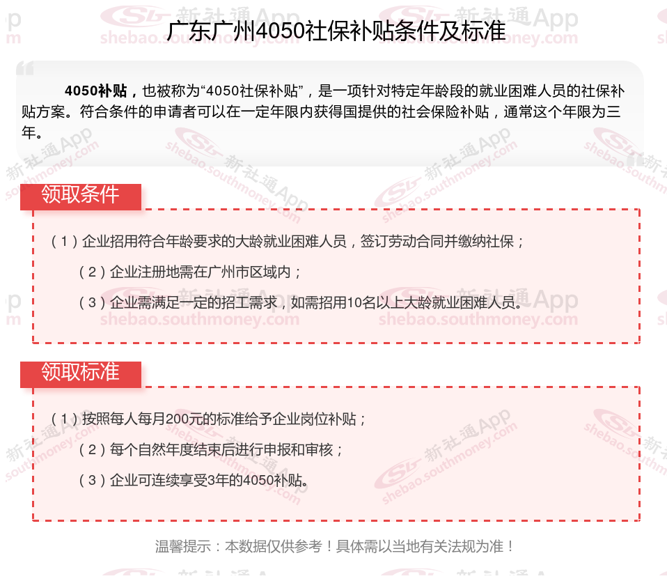 二、2025年广东广州4050社保补贴标准及条件,最新如下: