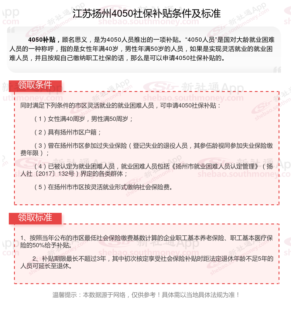 2025江苏扬州4050补贴主要针对的是年龄在40岁以上的女性和50岁以上的男性,这些人群通常因为年龄较大而面临就业困难。