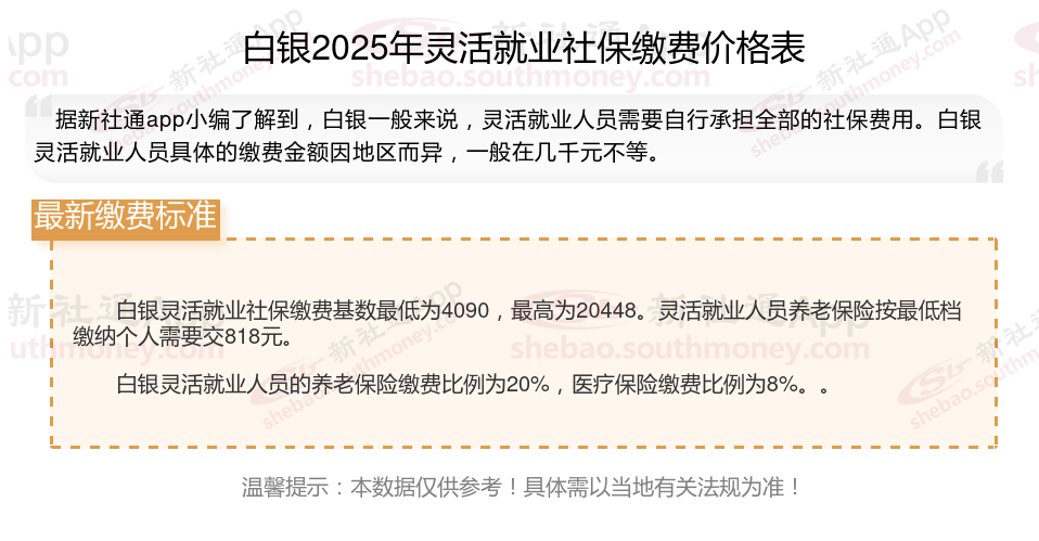 一、2025年白银灵活就业社保缴费标准公布啦 白银灵活就业社保多少钱一个月?