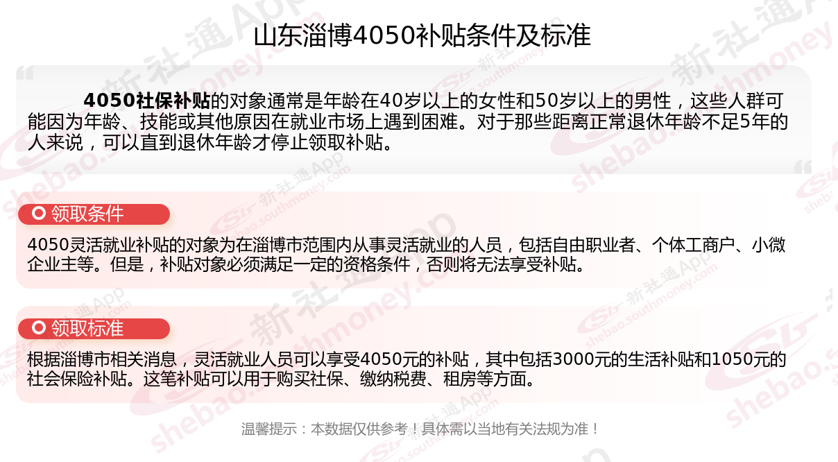 4050补贴需要以灵活就业身份参加职工养老和医疗保险,补贴标准不超过实际缴费的三分之二,最长3年,距离退休不足5年的可延长到退休。补贴对象包括国企下岗人员、低保家庭等。申请流程需要提交身份证、银行账户等。那么山东淄博4050灵活就业社保补贴标准是多少钱?山东淄博4050社保补贴条件是什么?接下来随新社通APP小编了解一下最新资讯。