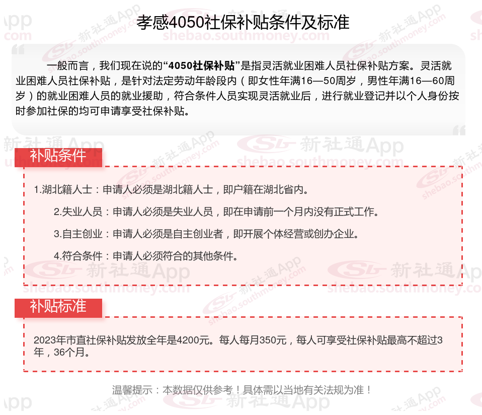 “灵活就业4050社保补贴”需要以灵活就业身份参加职工养老和医疗保险,补贴标准不超过实际缴费的三分之二,最长3年,距离退休不足5年的可延长到退休。补贴对象包括国企下岗人员、低保家庭等。申请流程需要提交身份证、银行账户等。那么孝感4050灵活就业困难人员社保补贴标准是多少?孝感4050社保补贴需要符合什么条件?接下来随新社通APP小编具体了解一下4050社保补贴内容。