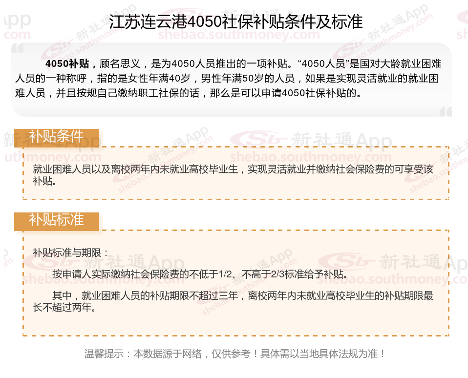 4050社保补贴标准据新社通app小编了解,通常,4050社保补贴包含基本医疗保险和基本养老保险两个险种,社保补贴金额为申请人实际缴纳基本养老保险和基本医疗保险金额的2/3,具体标准以当地社保局公布的数据为准!那么江苏连云港4050灵活就业困难人员社保补贴标准是多少?江苏连云港4050社保补贴需要符合什么条件?接下来随新社通APP小编具体了解一下4050社保补贴内容。