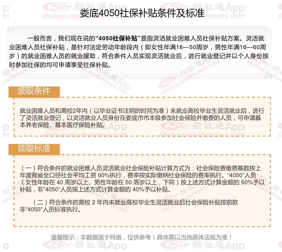 今天聊一下4050补贴话题。4050补贴听起来像是一个针对特定年龄人群的社保补贴。比如女性需年满40周岁,男性需年满50周岁(以申请当年12月31日为截止日期)。那么娄底4050灵活就业社保补贴标准是多少钱?娄底4050社保补贴条件是什么?接下来随新社通APP小编了解一下最新资讯。