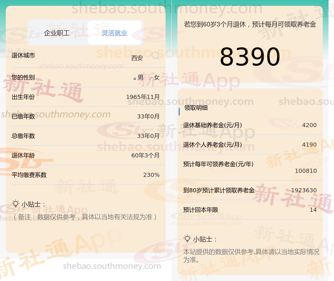 基本养老金计算公式为:(退休时上年度全市城镇单位就业人员月平均工资+本人指数化月平均缴费工资)÷2×缴费年限×1%。
