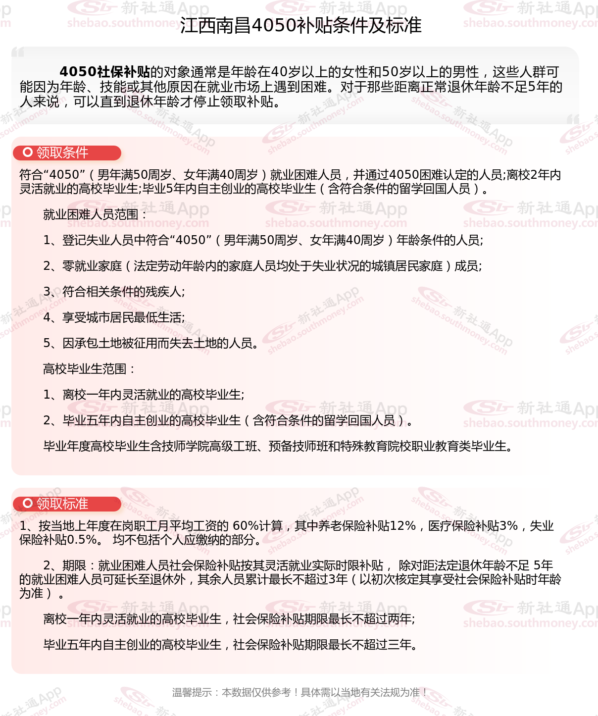 一、2025年江西南昌4050社保补贴标准及条件是多少?