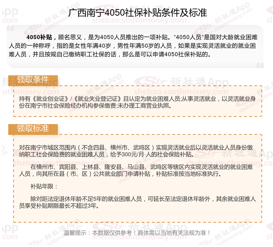 广西南宁4050灵活就业社保补贴是什么?今天聊一下4050补贴话题。4050补贴听起来像是一个针对特定年龄人群的社保补贴。比如女性需年满40周岁,男性需年满50周岁(以申请当年12月31日为截止日期)。那么广西南宁4050灵活就业社保补贴标准是多少钱?广西南宁4050社保补贴可以领取多少?接下来随新社通APP小编了解一下广西南宁4050灵活就业社保补贴的最新资讯。
