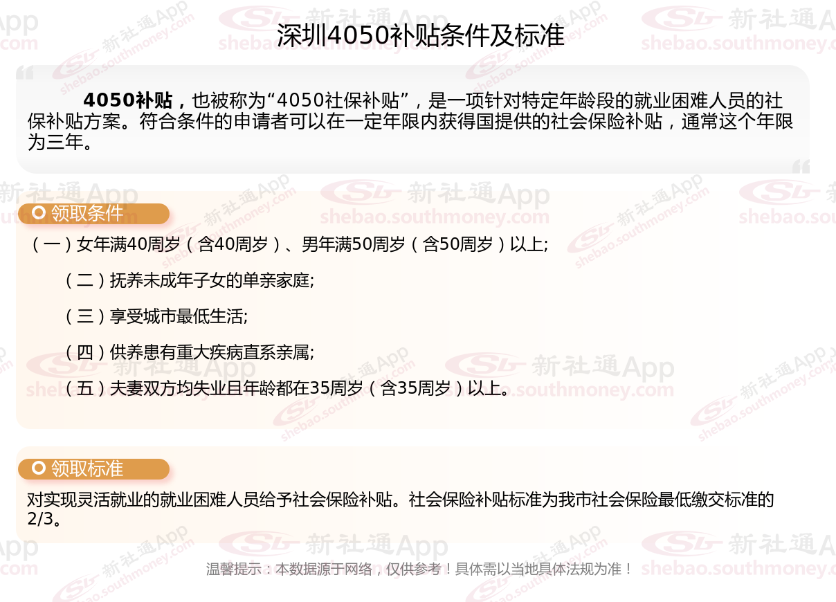 深圳4050灵活就业社保补贴是什么?今天聊一下4050补贴话题。4050补贴听起来像是一个针对特定年龄人群的社保补贴。比如女性需年满40周岁,男性需年满50周岁(以申请当年12月31日为截止日期)。那么深圳4050灵活就业社保补贴标准是多少钱?深圳4050社保补贴可以领取多少?接下来随新社通APP小编了解一下深圳4050灵活就业社保补贴的最新资讯。