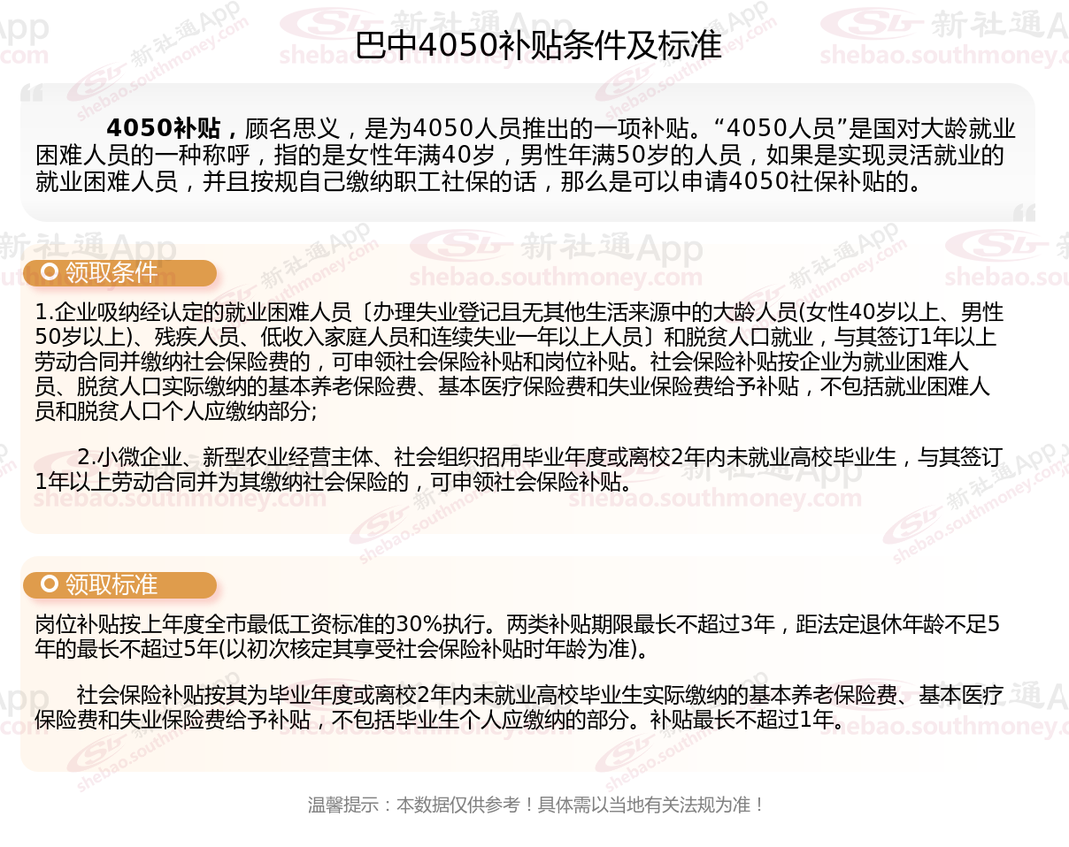 二、2025年巴中4050社保补贴标准及条件,最新如下: