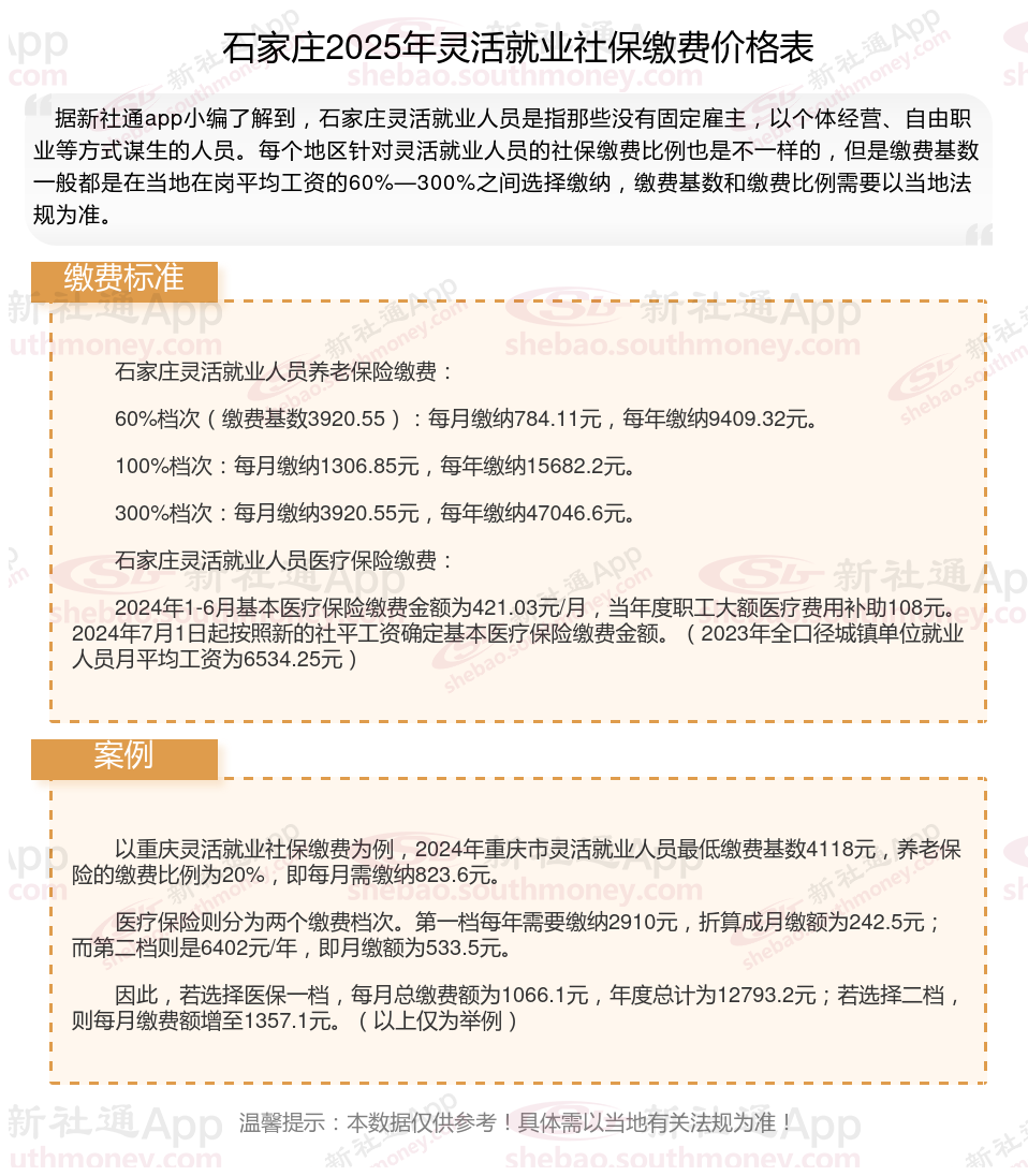 据新社通app数据显示,石家庄灵活就业人员养老保险缴费基数2024-2025年最新标准如下: