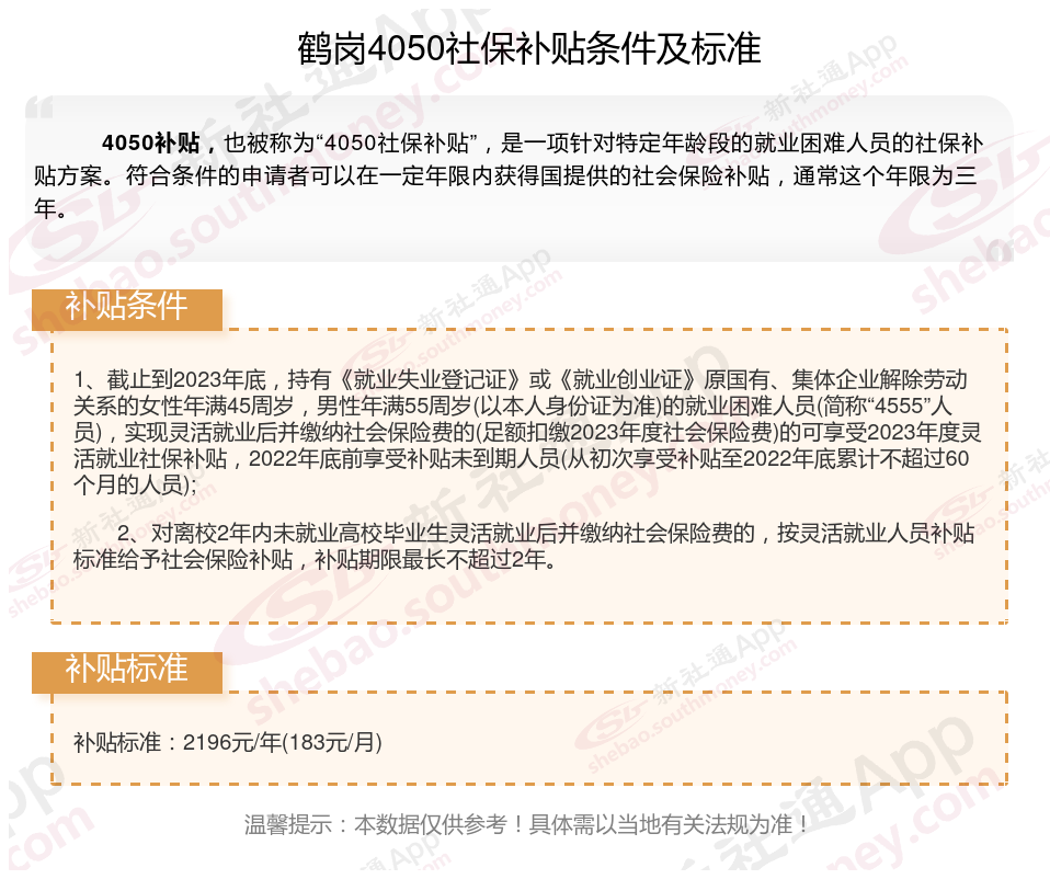 二、2025年鹤岗4050社保补贴标准及条件,最新如下: