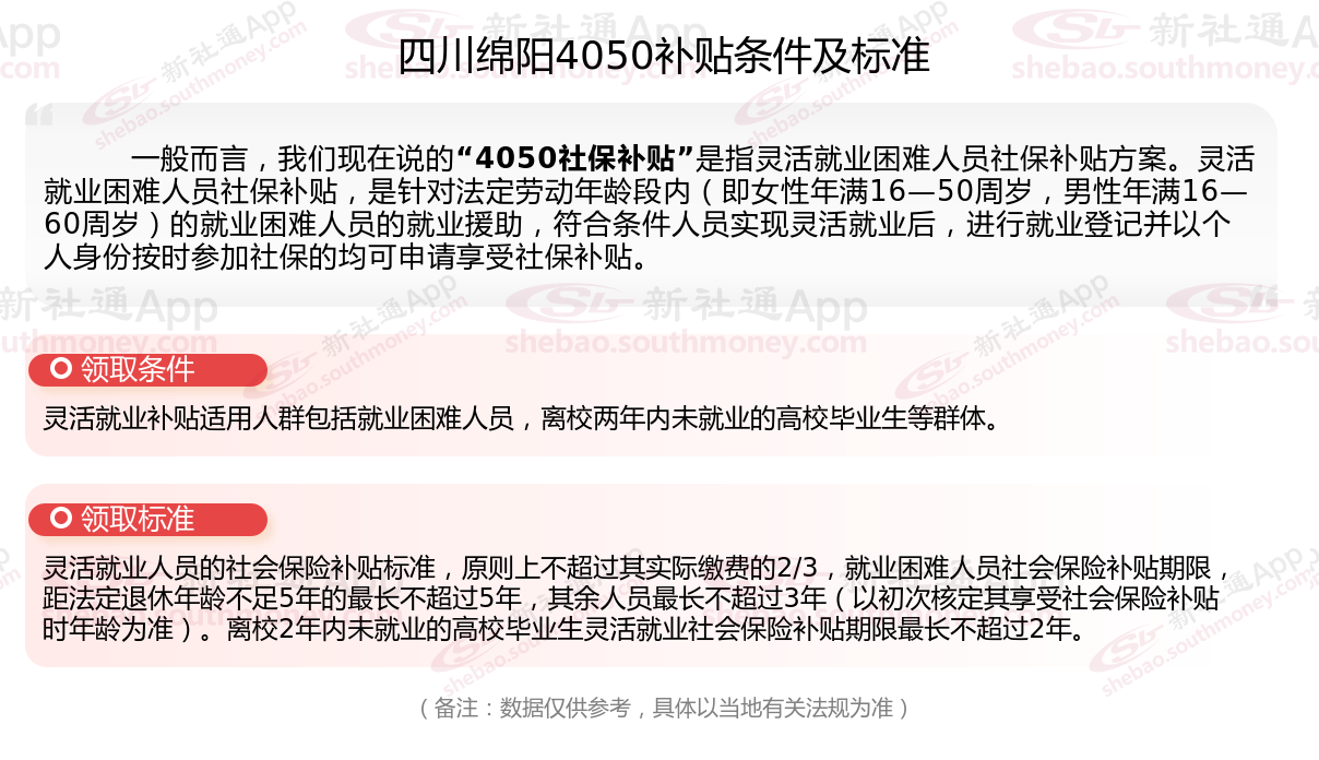 4050社保补贴标准据新社通app小编了解,通常,4050社保补贴包含基本医疗保险和基本养老保险两个险种,社保补贴金额为申请人实际缴纳基本养老保险和基本医疗保险金额的2/3,具体标准以当地社保局公布的数据为准!那么四川绵阳灵活就业人员4050补贴最新标准是多少,四川绵阳4050灵活就业人员社保补贴一年可以有多少钱?接下来随新社通APP小编具体了解一下4050社保补贴内容。