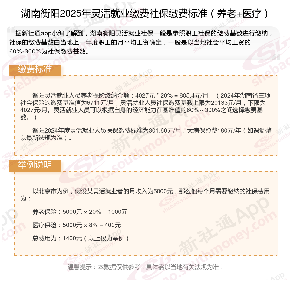 据新社通app数据显示,湖南衡阳灵活就业养老保险的缴费基数为:4027元。灵活就业人员参保缴费的比例为个人20%。